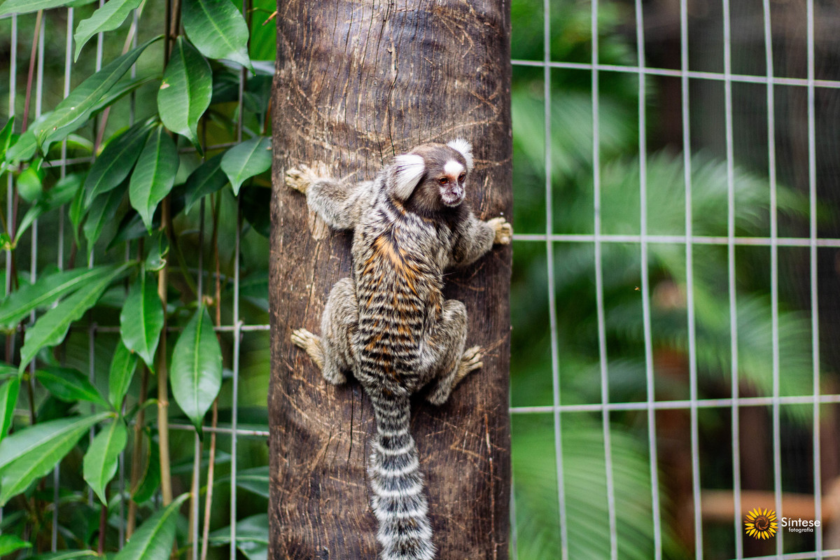 Um sagui-de-tufo-branco em sua rotina ágil, escalando o tronco de uma árvore com destreza e atenção. A beleza da vida selvagem capturada de forma espontânea, revelando a conexão entre o animal e seu habitat.